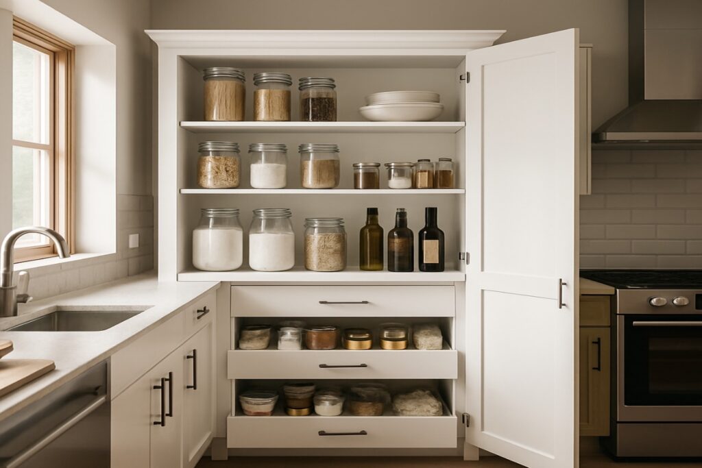 The design layout of your pantry cabinet should reflect your storage needs. Typically, the top section is designated for shelving, providing ample space for organizing items. The bottom section can accommodate drawers, perfect for storing canned goods, bulk items, and boxed goods efficiently. This thoughtful design maximizes the utility of your kitchen storage cabinet.