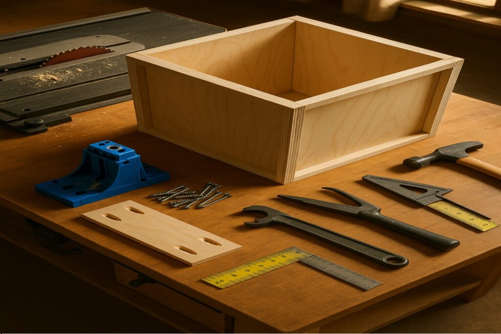 Constructing storage drawers requires careful consideration of materials and measurements. The drawers are crafted using ¾″ plywood for the sides and ½″ plywood for the bottom, ensuring durability and strength. Three shallow drawer boxes are meticulously assembled, each complemented by a drawer front cut from ¾″ plywood. These fronts are attached from the inside with screws, providing a seamless and polished appearance. This thoughtful design not only adds extra storage to your kitchen but also enhances the cabinet’s functionality and aesthetic appeal.